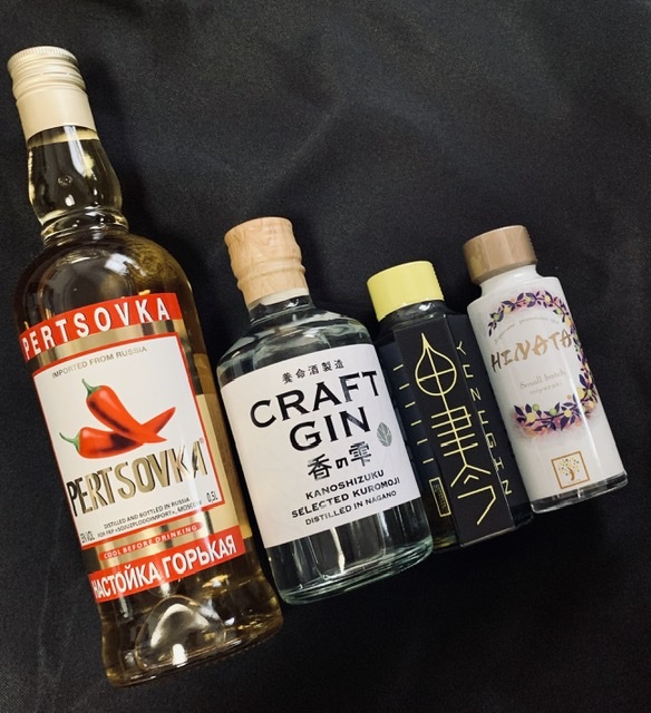 高級爪楊枝の材料のクロモジがメインの養命酒ジン・宮崎の和柑橘をベースにし人気の芋焼酎2種を使用した柚子スパイスジン・こちらも宮崎の「ひなた」のような暖かく柔らかなフレーバーのボタニカルジン